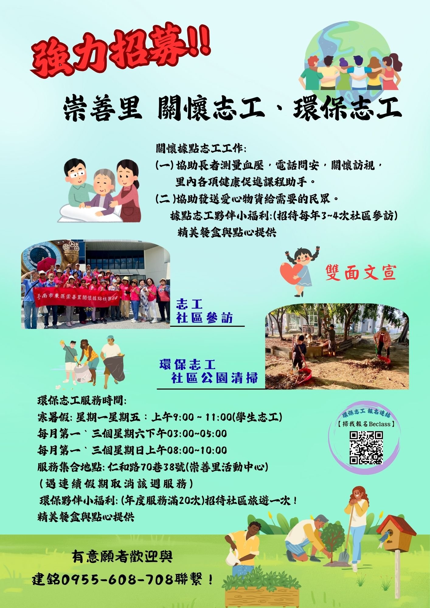 開啟上方區塊 內容管理:崇善里 強力招募!! 關懷志工、環保志工-臺南東區崇善里資訊網-崇善里 選擇後頁面內容會更新 選擇觀看內容 新聞公告簡介資訊常見問題 新聞公告 / 內容類型:新聞類型 新聞公告首頁 志工訊息 瀏覽:384 搜尋 選擇新聞公告分類 里民公告防疫資訊防災資訊會計專區社福專區商家推薦市府新聞 選擇內容年度 115年 (2026)114年 (2025)113年 (2024)112年 (2023)111年 (2022)110年 (2021) 送出 置頂內容 崇善里 強力招募!! 關懷志工、環保志工 發佈者:龔惠萍 / 發佈時間:2026-01-13 / 內容狀態:啟用中 ::: 活動訊息 政令宣導 志工訊息 環境清潔 課程報名 生活資訊 役政相關 里民問題 就業資訊 健康資訊 里民服務 內容標籤 教學 20節日 33資訊 248緊急 22特色 77注意 129活動 142防疫 84簡介 9清潔 30回覆 15好康 71公告 103宣導 109重要 126課程 36 頁面QRcode 崇善里 強力招募!! 關懷志工、環保志工 響應你買菜我捐錢買菜做公益活動~里長贈送志工新鮮蔬菜 崇善里辦公處誠徵【社區關懷志工】! 113年崇善關懷協會暨志工隊新春團拜餐會活動溫馨舉辦 崇善里志工中秋夜團圓活動 崇善里志工榮譽狀頒發暨感恩茶會 觀看更多內容 ::: 置頂內容 崇善里 強力招募!! 關懷志工、環保志工 崇善里 強力招募!! 關懷志工、環保志工 關懷據點志工工作: (一) 協助長者測量血壓,電話問安,關懷訪視, 里內各項健康促進課程助手。 (二 )協助發送愛心物資給需要的民眾。 據點志工夥伴小福利:(招待每年3~4次社區參訪) 精美餐盒與點心提供 環保志工服務時間: 寒暑假: 星期一星期五:上午9:00~11:00(學生志工) 每月第一`三個星期六下午03:00~05:00 每月第一`三個星期日上午08:00~10:00 服務集合地點: 仁和路70巷38號(崇善里活動中心) ( 遇 連 續 假 期 取 消 該 週 服 務 ) 環保夥伴小福利: (年度服務滿20次)招待社區旅遊一次 ! 精美餐盒與點心提供 前往活動報名頁面 內文可瀏覽群組: 註冊會員 訪客 內容附件下載 Download attachment 線上瀏覽檔案 招募志工 檔案下載 新聞公告-相關內容 related information 臺南市志願服務推廣中心辦理111年「臺南市志願服務在職訓練」課程訊息 崇善里志工榮譽狀頒發暨感恩茶會 崇善里志工中秋夜團圓活動 崇善里辦公處誠徵【社區關懷志工】! 113年崇善關懷協會暨志工隊新春團拜餐會活動溫馨舉辦 崇善里 強力招募!! 關懷志工、環保志工 崇善里學生志工服務時間 響應你買菜我捐錢買菜做公益活動~里長贈送志工新鮮蔬菜 ←前往上一頁
