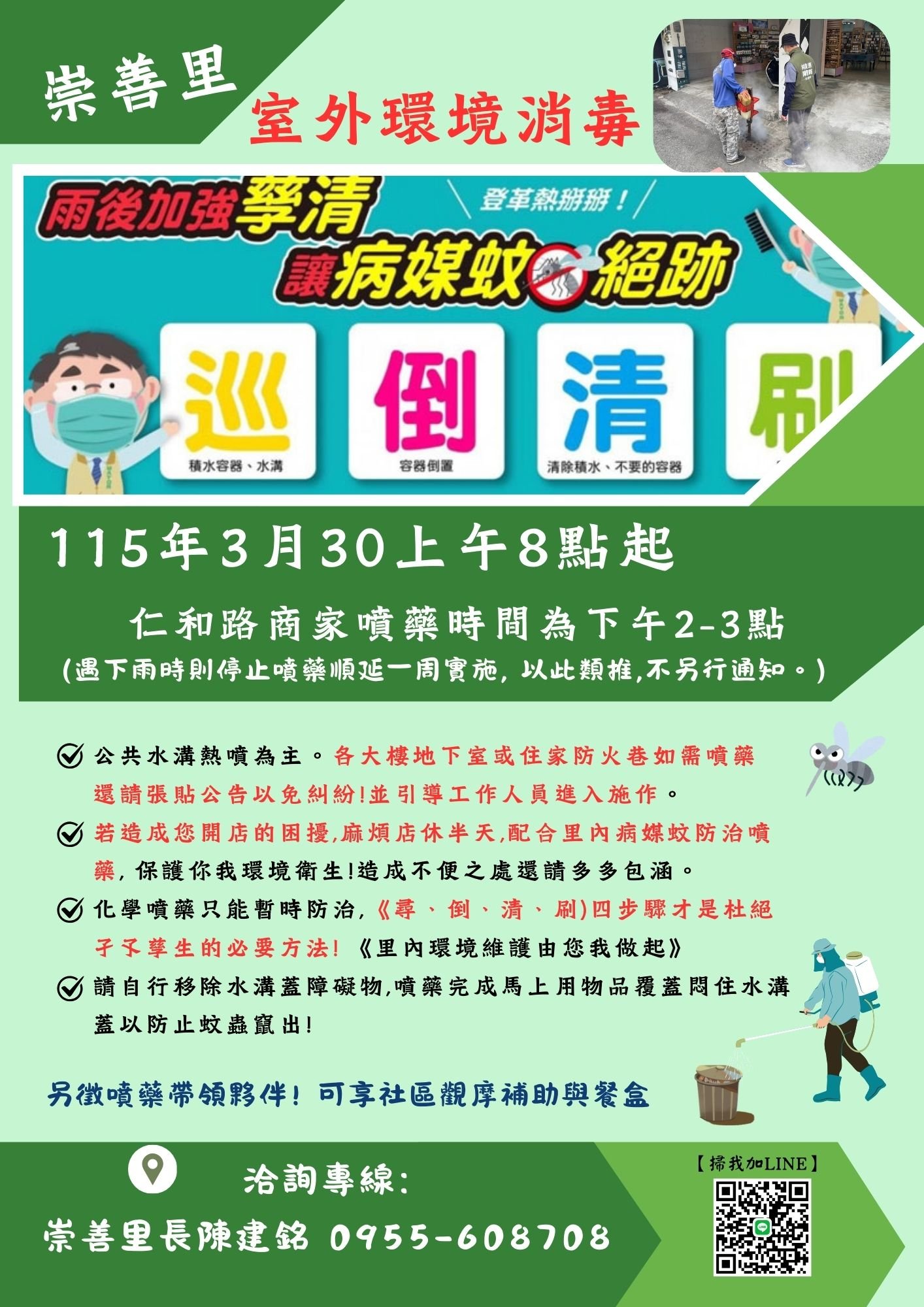 開啟上方區塊 內容管理:崇善里-室外環境消毒-臺南東區崇善里資訊網-崇善里 選擇後頁面內容會更新 選擇觀看內容 新聞公告簡介資訊常見問題 新聞公告 / 內容類型:新聞類型 新聞公告首頁 環境清潔 瀏覽:123 搜尋 選擇新聞公告分類 里民公告防疫資訊防災資訊會計專區社福專區商家推薦市府新聞 選擇內容年度 115年 (2026)114年 (2025)113年 (2024)112年 (2023)111年 (2022)110年 (2021) 送出 置頂內容 崇善里-室外環境消毒 發佈者:龔惠萍 / 發佈時間:2026-03-09 / 內容狀態:啟用中 ::: 活動訊息 政令宣導 志工訊息 環境清潔 課程報名 生活資訊 役政相關 里民問題 就業資訊 健康資訊 里民服務 內容標籤 教學 20防疫 84回覆 15資訊 248簡介 9公告 103活動 142宣導 109清潔 30好康 71節日 33緊急 22重要 126課程 36特色 77注意 129 頁面QRcode 崇善里-室外環境消毒 115年大型傢具清運通知 崇善里環保夥伴與學生志工招募-做志工顧健康!! [以功代金]作伙來 崇善里 9/1 室外環境消毒 臺南市違規檢舉指引 觀看更多內容 ::: 置頂內容 崇善里-室外環境消毒 崇善里-室外環境消毒 115年3月30上午8點起 仁和路商家噴藥時間為下午2-3點 (遇下雨時則停止噴藥順延一周實施, 以此類推,不另行通知。) *公共水溝熱噴為主。各大樓地下室或住家防火巷如需噴藥`,還請張貼公告以免糾紛!並引導工作人員進入施作。 *若造成您開店的困擾,麻煩店休半天,配合里內病媒蚊防治噴藥, 保護你我環境衛生!造成不便之處還請多多包涵。 *化學噴藥只能暫時防治,《尋、倒、清、刷)四步驟才是杜絕孑孓孳生的必要方法! 《里內環境維護由您我做起》 請自行移除水溝蓋障礙物,噴藥完成馬上用物品覆蓋悶住水溝`,蓋以防止蚊蟲竄出! 內文可瀏覽群組: 註冊會員 訪客 內容附件下載 Download attachment 線上瀏覽檔案 260330室外環境消毒 檔案下載 新聞公告-相關內容 related information 崇善里環保局水溝清淤,民眾反映!選前不忘選民託付! 115年大型傢具清運通知 崇善里-室外環境消毒 室外噴藥通知-112年03月02日(星期四)上午8時起 善里街道環保局水溝清淤作業-防範汛期積水及消除病媒蚊 崇善路水溝清淤作業~里長協助商家開啟水溝蓋鐵板 崇善里活動中心環境打掃!-防治病媒蚊孳生 113年03月崇善里室外環境消毒通知 崇善里111年01月24日國家清潔週通知 [以功代金]作伙來 崇善里 9/1 室外環境消毒 崇善里新購置奧地利堆肥箱,請各位里民妥善利用,環保再生循環不息。 崇善六街選後加強側溝清淤作業 崇善里室外噴藥通知-112年06月26日(星期一) 崇善里環保夥伴與學生志工招募-做志工顧健康!! ←前往上一頁